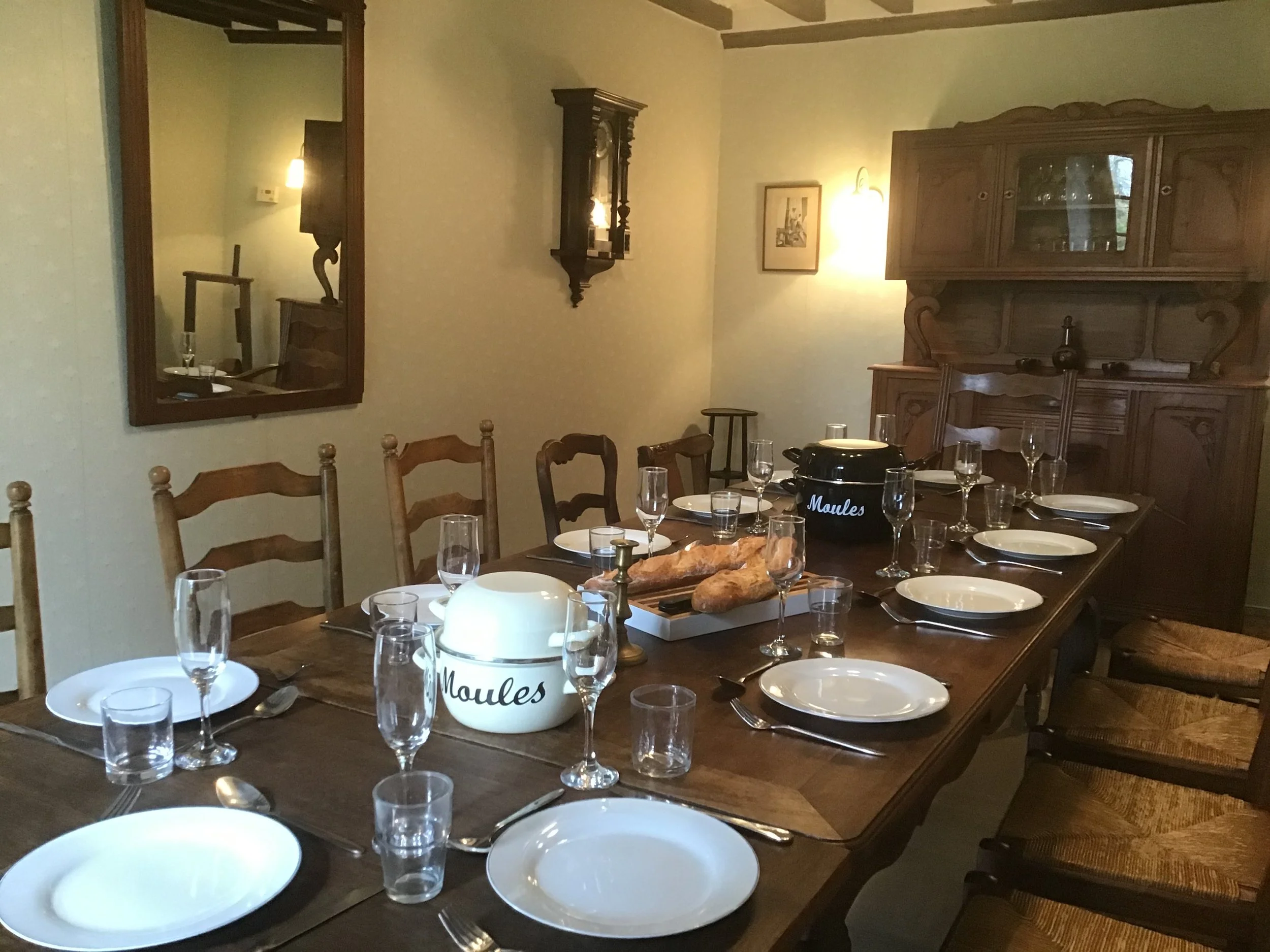 Entrance hall with cloakroom and WC. Large beamed drawing room with exposed stone walls and huge Normandy fireplace. Beamed dining room with table for 12.